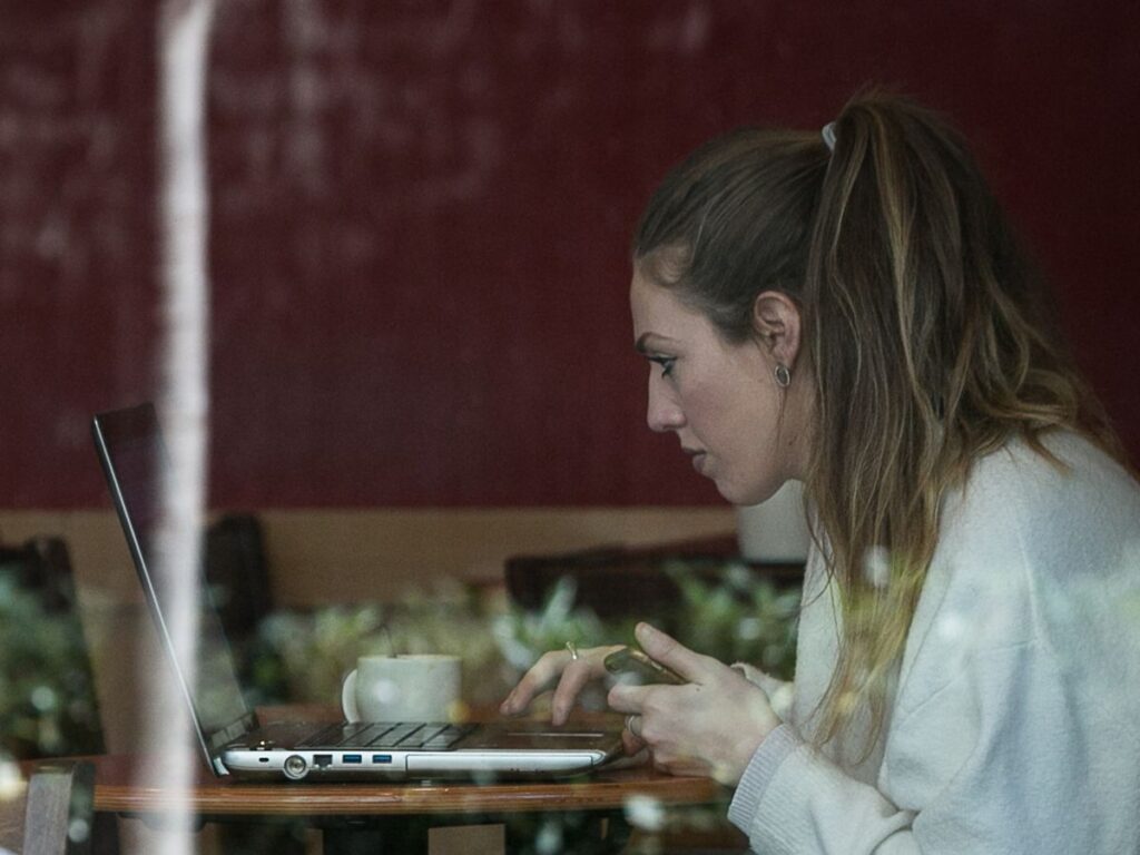Una joven consulta su dispositivo móvil y su portátil a la vez mientras desayuna en el interior de una cafetería.Albert Garcia
