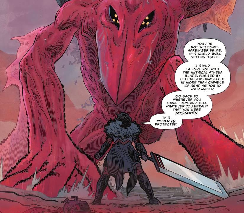 Si bien es típico que ella empuñe un lazo en una pelea, la espada gigante de Wonder Woman es una adición inesperada a su arsenal. Aunque ha luchado con espadas en el pasado, ésta es mucho más imponente. Diana se refiere a esta espada como “la mítica espada de Atenea”.y hace honor a su increíble nombre ya que lo usa para combatir Harbinger Prime. La espada en sí también tiene vínculos con su lado mágico, ya que su funda es una pequeña bolsa impregnada de un encantamiento. Estas armas no son todo lo que Wonder Woman tiene de su lado, ya que tiene otra arma secreta.
