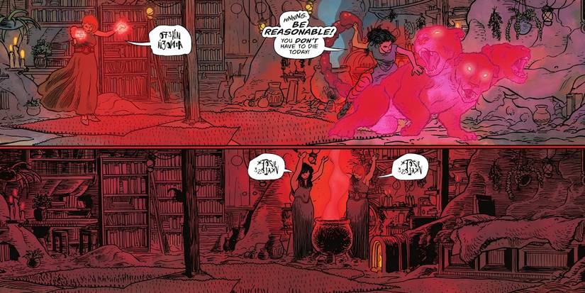 Su crianza en el infierno no solo refuerza la resistencia de esta Mujer Maravilla a través de las dificultades, sino que también explica cómo llega a aprender la magia oscura que utiliza en el campo de batalla. Circe cría a Diana y así su magia pasa a su hija. En flashbacks a lo largo del número, se ve a Circe pronunciando encantamientos y mezclando pociones, y pronto se representa a Diana haciendo lo mismo. Además, la magia no es todo lo que Wonder Woman recibe de su madre. Circe revela que le ha otorgado las “mayores armas imaginables” a su hijay Wonder Woman no pierde el tiempo en mostrarlos.