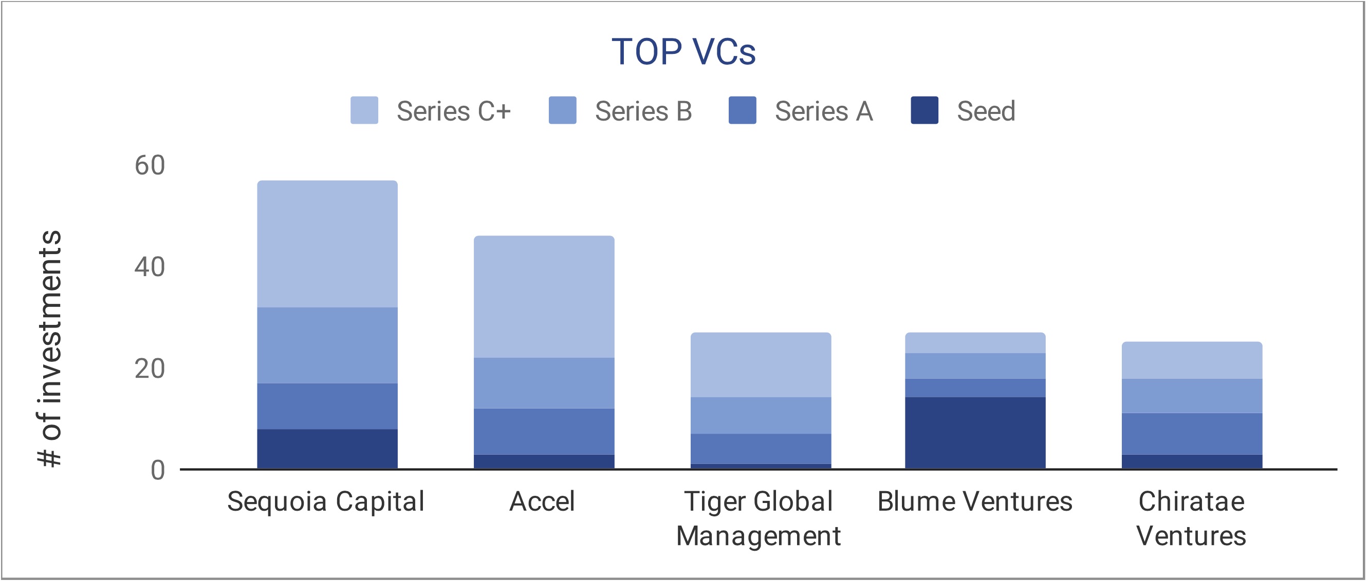 Sequoia Capital, con más de 50 inversiones, o coinversiones, fue el fondo de capital de riesgo más activo para las nuevas empresas tecnológicas indias este año. (Rajan Anandan, ex ejecutivo a cargo de los negocios de Google en India y el sudeste asiático, se unió a Sequoia Capital India como director gerente en abril). Accel, Tiger Global Management, Blume Ventures y Chiratae Ventures fueron los otros cuatro principales VC.