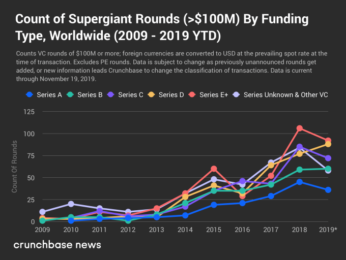 Antes de volver a los datos de CBInsights, observemos un gráfico de Crunchbase News que subraya simplemente asombroso aumento de $ 100 millones de financiamientos que se publicó hace solo unas semanas. Al mirar este cuadro, recuerde que antes de 2016, más de la mitad de las empresas de tecnología respaldadas por empresas que se hicieron públicas habían recaudado menos de $ 100 millones total: