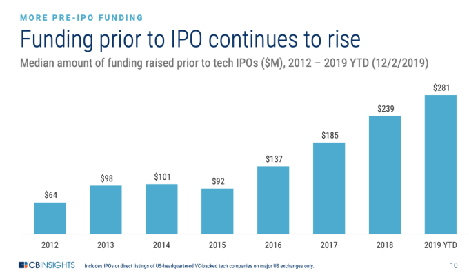 Según el reciente informe IPO 2020 IPO de CBInsights, hay una fuerte y al alza en la cantidad de capital que las empresas tecnológicas recaudan antes de que se hagan públicas. Es tan empinado que los datos dibujan una ruptura casi lineal de una normal anterior cómoda.