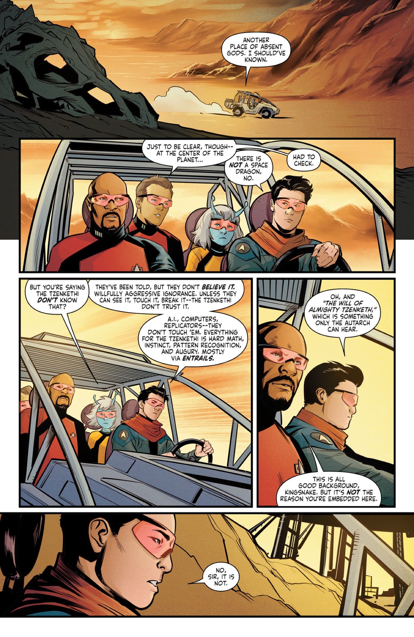 Star Trek El número 14, segunda parte de “Glass and Bone”, está escrito por Jackson Lanzing y Collin Kelly y dibujado por Marcus To. Harry Kim, que ha estado trabajando encubierto en el espacio Tzenkethi, les dice al Capitán Sisko, Tom Paris y al Alférez Sato que los Tzenkethi son sorprendentemente de baja tecnología. Evitan muchas innovaciones tecnológicas del siglo XXIV, como los replicadores y la inteligencia artificial. Kim dice de su tecnología: “a menos que puedan verlo, tocarlo, romperlo, los Tzenkethi no confían en ello.“