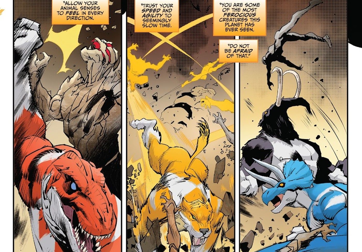 En Mighty Morphin Power Rangers/Teenage Mutant Ninja Turtles II, la alianza Rita Repulsa/Krang logró aislar a los Adolescentes con actitud de Morphin Grid. Para seguir peleando la buena batalla, Blue Ranger y Donatello descubrieron una manera de combinar el mutágeno y la energía Morphin restante de los Rangers para transformarlos. Ahora, los Rangers luchan como dinosaurios, tigres dientes de sable y dragones. En el número 4, de Ryan Parrott y Dan Mora, el entrenamiento de Splinter permite que los Rangers finalmente se sientan cómodos en sus nuevos cuerpos y adquieran una gama de nuevas habilidades. Los Rangers ahora no solo luchan con garras, dientes y cuernos, sino que la forma en que perciben el mundo ha cambiado.