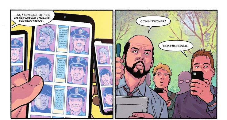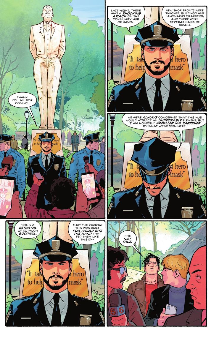En Ala noche # 93, escrito por Tom Taylor con arte de Bruno Redondo, Nightwing aborda uno de los principales problemas de Blüdhaven de una manera claramente diferente a la de Batman. El comisionado del Departamento de Policía de Blüdhaven está dando un discurso denunciando un ataque en el centro comunitario de Haven. Declara que fueron las mismas personas para las que Haven fue construido quienes hicieron esto. Dick deja que el discurso continúe, permitiendo que el comisionado cave su propia tumba, antes de interrumpir y revelar que los perpetradores eran en realidad miembros del departamento de policía. Oracle transmite la prueba a todas las principales redes de noticias, exponiendo con éxito el discurso anterior del comisionado como nada más que mentiras.