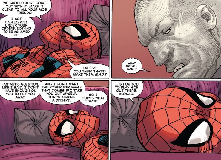 Sabiendo que crear un vacío de poder hará mucho más daño que bien, Spider-Man elige chantajear a Tombstone para mantener contenido al crimen organizado. Si bien es el menor de dos males, sigue siendo un escenario moralmente más ambiguo de lo que Spider-Man está acostumbrado. Incluso Tombstone está impresionado con las nuevas tácticas de Spider-Man (lo cual no es exactamente algo bueno). Si bien es interesante ver este lado algo más oscuro de Spider-Man, puede correr el riesgo de volverse demasiado oscuro (potencialmente perderse en el proceso).