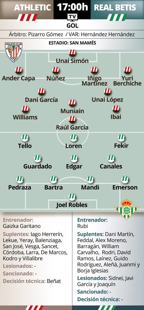 No se esperan demasiadas modificaciones en el once verdiblanco. “Habrá alguna, pero el número no será tan grande como del día del Sevilla al Granada”, declaró Rubi, quien cuenta con las bajas de Sidnei, Javi García y el veterano Joaquín. El Athletic se libra del hombre del ‘hat trick’ en el Villamarín. Son varias las opciones que baraja para sustituir al extremo: Lainez, Tello, Aleñá… Parece claro que Edgar González seguirá ejerciendo de ancla en la zona ancha para dejar la magia con el balón a Canales y Fekir. Para buscar el gol, el entrenador deberá elegir entre Borja Iglesias o Loren Morón.