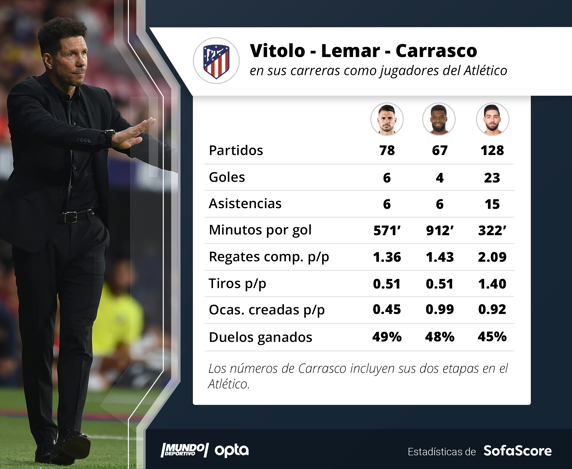 Madrid. Por ese motivo en los últimos años han fichado a Vitolo, Lemar y en este mercado de invierno a Carrasco. Tres futbolistas que están luchando por un puesto y que no terminan de convencer ni al técnico ni a la afición colchonera.