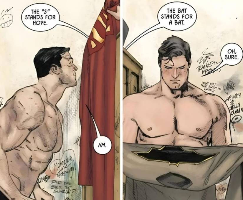 Mientras Las mejores del mundo ¿Un trabajo excelente al mostrar la naturaleza más alegre de Batman, generalmente expresada a través de su abrazo de un papel paternal, se pueden encontrar ejemplos de su humor seco específicamente en Tom King’s? Ordenanza correr. Uno de los momentos más notables aparece en Ordenanza #37, donde Bruce y Clark cambian los trajes para obtener la entrada a una feria. A medida que cambian en vestuarios separados, Clark menciona que su icónico “S” Shield significa Hope. Batman responde con: “El murciélago representa un bate”. Este es un ejemplo perfecto del humor seco y discreto de Bruce en su máxima expresión.