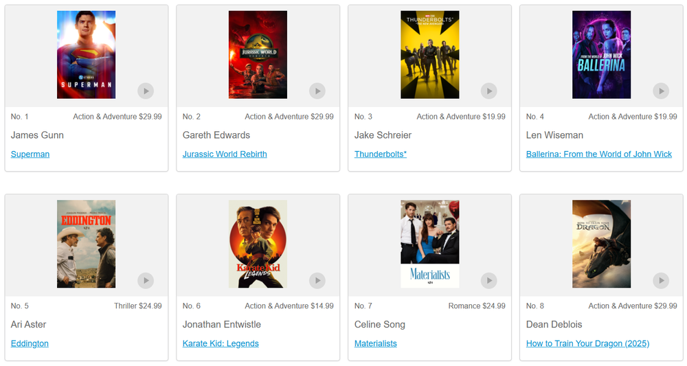 El éxito de Superman ha continuado transmitiendo, ya que, según Itopchart, actualmente es el alquiler número uno durante su primer fin de semana en VOD para iTunes. La película es seguida por Jurassic World Rebirth en segundo y Thunderbolts* en tercero.