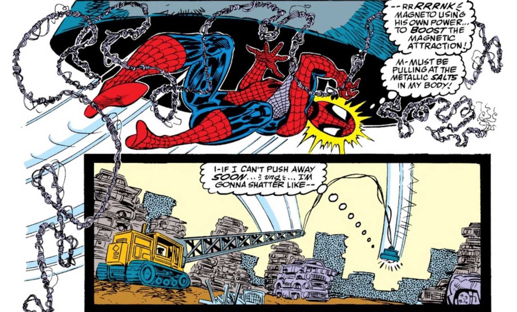 Mientras que la extracción de hierro de Magneto en la película fue impresionante, El asombroso Spider-Man #327 – Escritado por David Michelinie e ilustrado por Erik Larsen, muestra los poderes de Magneto en un nivel completamente nuevo. En este tema, Magneto intenta reclutar a Spider-Man, creyendo erróneamente que es un mutante cuyos poderes se manifestaron más adelante en la vida.