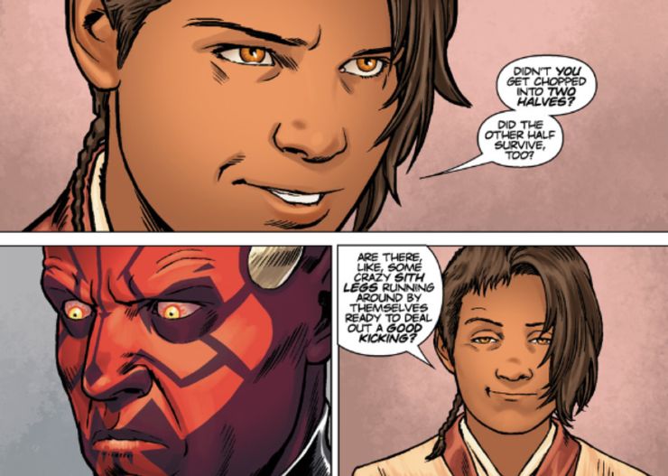 Curiosamente, la idea se remonta al diálogo humorístico en Darth Maul: Sentencia de muerte como aparece en Clone Wars: Colección épica Volumen 2 (escrito por Tom Taylor con arte de Bruno Redondo). En esa historia, la idea de las piernas perdidas de Darth Maul, igualmente perdidas, igualmente presuntamente muertas e igualmente mortales, se aborda directamente, preguntándose si el Lord Sith realmente sabe si ahora está dos seres empeñados en la venganza. O, como dice el cómic, “¿Piernas locas de Sith corriendo solas listas para dar una buena patada?”
