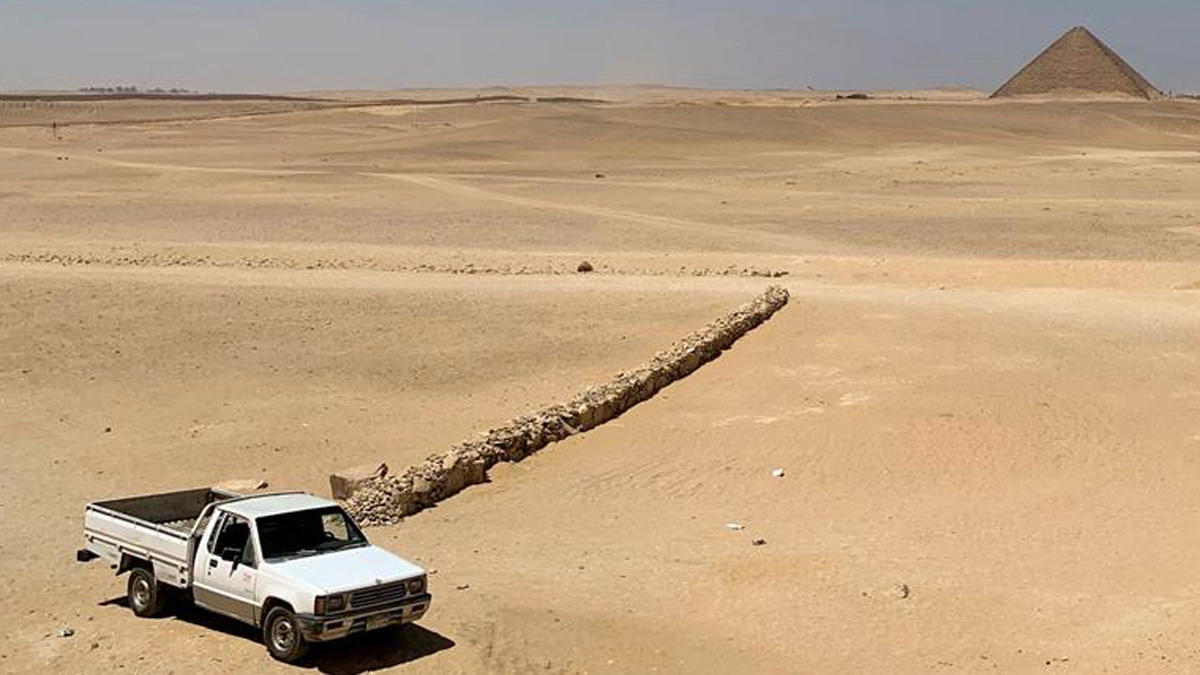 La pirámide Acodada o Romboidal, la más antigua, es la única que mantiene parte del revestimiento original de piedra caliza, pero su estructura no era del todo triangular.