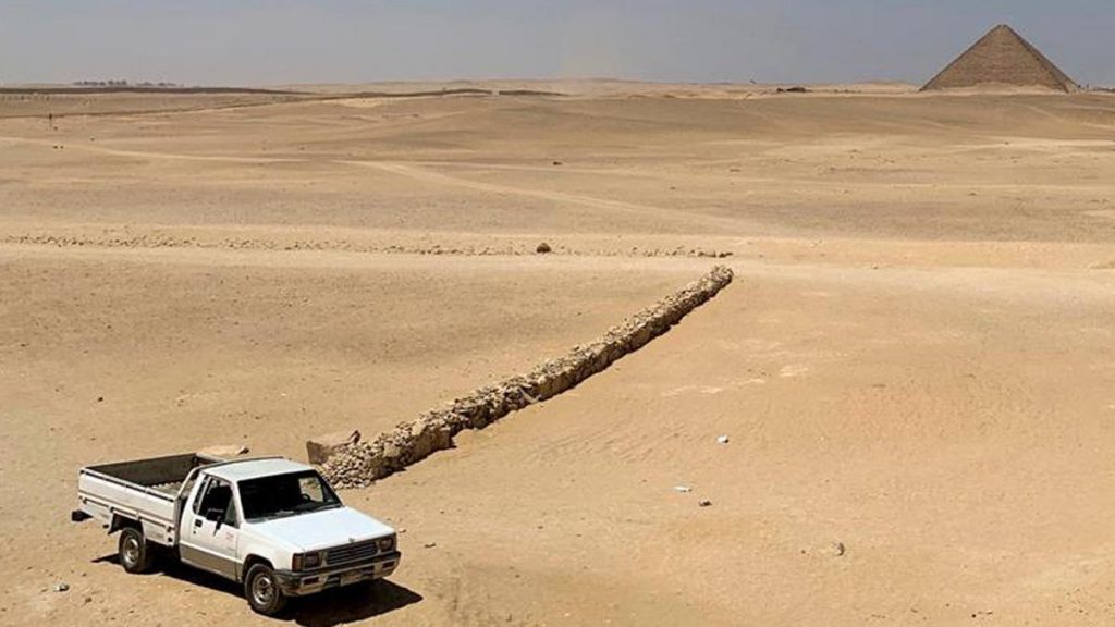 La pirámide Acodada o Romboidal, la más antigua, es la única que mantiene parte del revestimiento original de piedra caliza, pero su estructura no era del todo triangular.