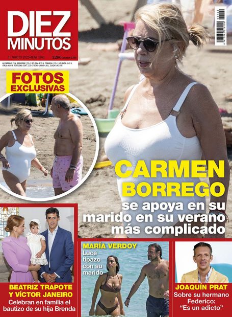 Por último, Diez Minutos publica en portada un reportaje de las vacaciones de Carmen Borrego con su marido, en su verano más complicado. La revista ofrece también unas imágenes del bautizo de la hija de Beatriz Trapote y Víctor Janeiro, a pocos días de que el hermano de Jesulín de Ubrique se embarque en una nueva aventura televisiva. Cierran la cubierta unas declaraciones de Joaquín Prat y un reportaje de María Verdoy en la playa junto a su marido.