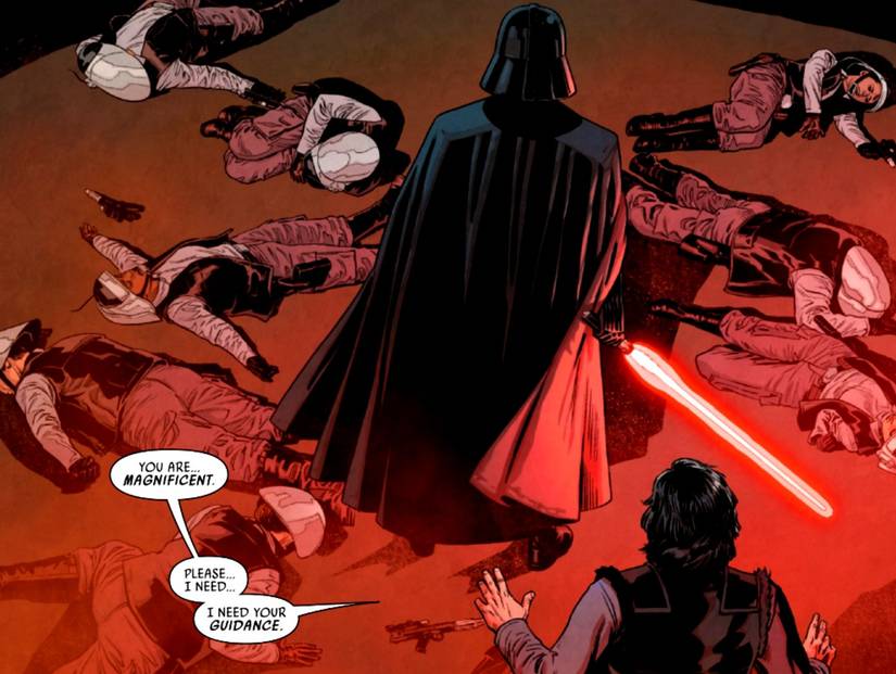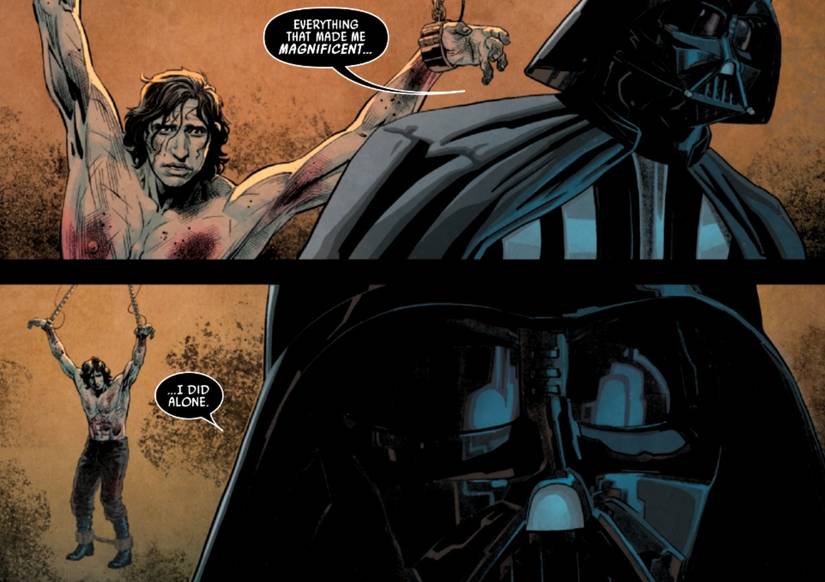 En Star Wars: Legacy of Vader #3 – Por Charles Soule, Luke Ross, Nolan Woodard y Joe Caramagna – Kylo Ren es torturado por el gángster Gardulla The Hutt. Después de ser electrocutado repetidamente, Kylo está expuesto a un gas que Gardulla promete lo hará “Vea cosas increíbles, visiones del pasado y el futuro”.