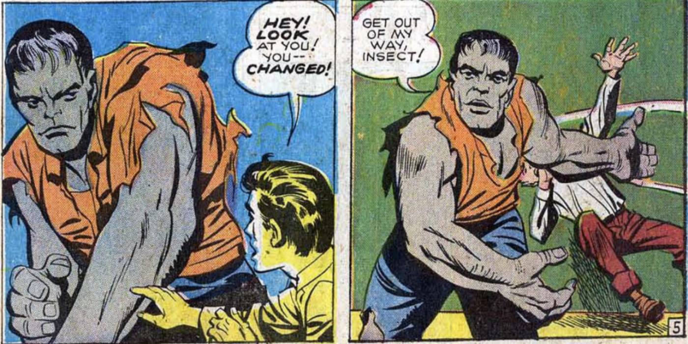En El increíble Hulk #1 de Stan Lee y Jack Kirby, los lectores conocen a Bruce Banner, quien recibe todo el poder de su propia bomba gamma mientras intenta salvar a Rick Jones, transformándolo en el Increíble Hulk. Después de que Banner se convirtiera en Hulk, Rick Jones le preguntó si estaba bien, sólo por el momento. Hulk para golpear a Rick a un lado y decir: “¡Apártate de mi camino, insecto!“.