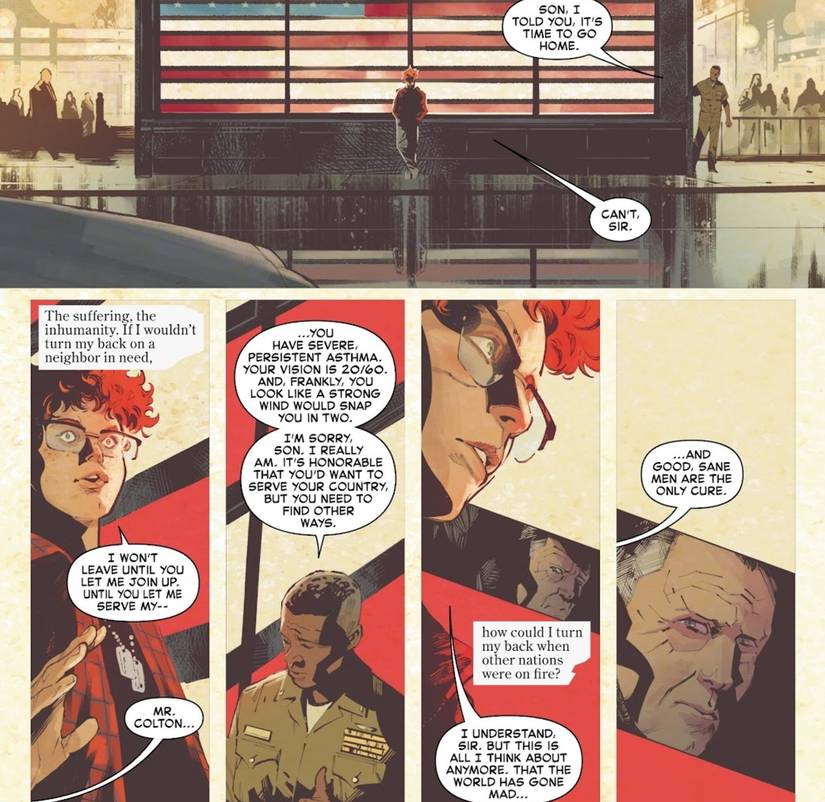 Capitán América #1 Comienza con Colton presenciando la destrucción del World Trade Center, ya que los propios pensamientos de Steve sobre su carrera hacen eco de lo que el joven está experimentando. Los flashbacks ven a Colton (como Steve antes que él) intentando repetidamente inscribirse con el ejército, a pesar de ser rechazado. Cuando se le pide que saliera de la estación de reclutamiento, Colton responde, “No puedo, señor”.