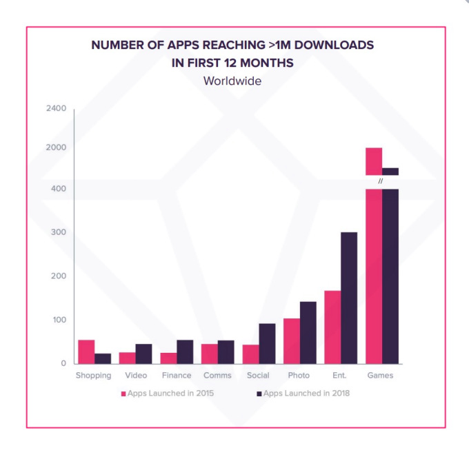 Las aplicaciones también están alcanzando los hitos de 1 millón de descargas más rápidamente, en datos analizados de 2015 a 2018. En las categorías de video, finanzas, comunicaciones, redes sociales, fotos y entretenimiento, el 67% de las aplicaciones alcanzaron el hito de 1 millón de descargas dentro de sus primeros 12 meses, dice la aplicación Annie.