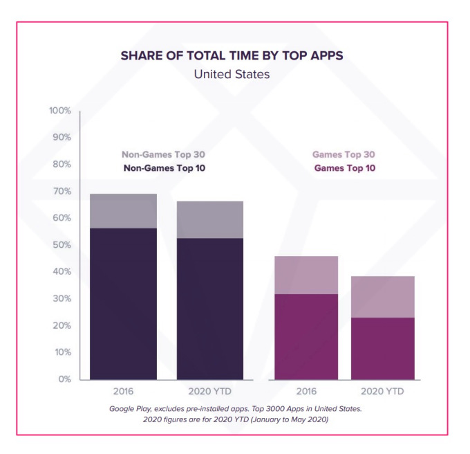 Las 30 principales aplicaciones que no son juegos representaron el 69.4% del tiempo total de los usuarios de EE. UU. En 2016 entre los que no son juegos. Eso cayó al 65.5% en 2019, una disminución de casi 4%. Entre los juegos, la participación cayó del 49% al 39%, una caída del 10%. (Esta información se obtuvo de Google Play en los EE. UU.)