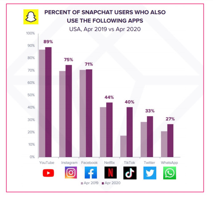 Por ejemplo, el 89% de los usuarios de Snapchat también usaron YouTube en abril de 2020 en los EE. UU., Y el 75% también usó Instagram.