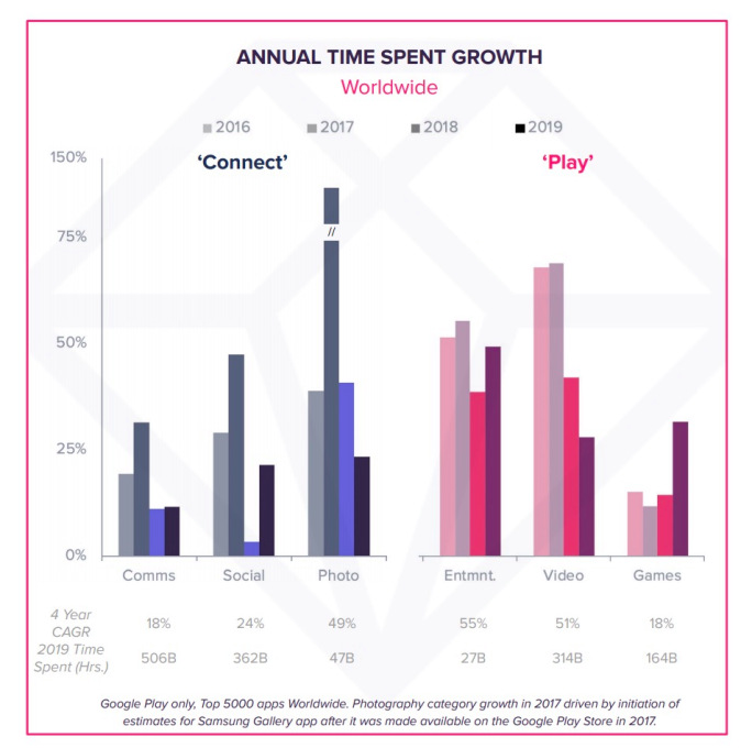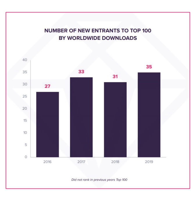 A medida que los usuarios aumentaron su tiempo en la aplicación a 3.1 horas por día, también comenzaron a usar más de una variedad de aplicaciones. Según el informe, 35 de las 100 mejores aplicaciones eran nuevos participantes en 2019, frente a 27 en 2016 en categorías que incluían redes sociales, fotografía, video, comunicaciones, entretenimiento y más.