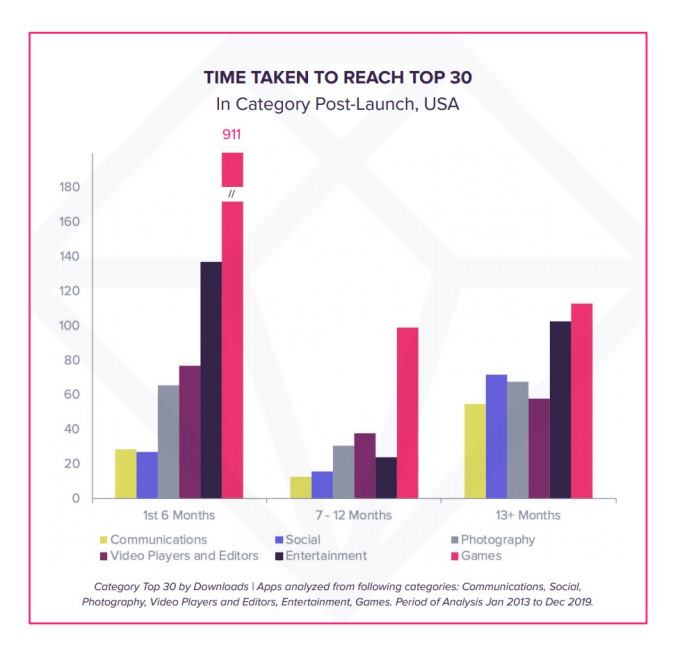 No solo los consumidores están más abiertos a probar nuevas aplicaciones, el informe encontró que las nuevas aplicaciones también pueden lograr rápidamente el éxito de la tienda de aplicaciones. En los Estados Unidos, por ejemplo, más del 60% de las aplicaciones pueden alcanzar el Top 30 de su categoría en sus primeros 6 meses.
