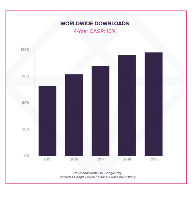 En los últimos cinco años, las descargas mundiales continuaron creciendo hasta alcanzar un récord de 120 mil millones en 2019, con varios países clave que ahora impulsan el crecimiento, incluida la India (10% de crecimiento interanual en 2019), Brasil (9%), Indonesia (8%) y Rusia (7%).