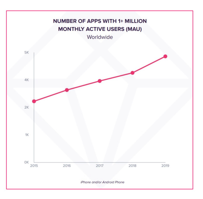 También hay más aplicaciones que nunca capaces de alcanzar la métrica de 1 millón de usuarios activos mensuales (MAU). En 2019, más de 4,600 aplicaciones vieron 1 millón de MAU, incluidas aquellas fuera de las redes sociales y las comunicaciones como Netflix, Roku, Disney, CBS, Amazon, Alibaba, Walmart, Target, PayPal, Venmo, Chase, Capital One, Uber, DoorDash, McDonald’s, y Starbucks.
