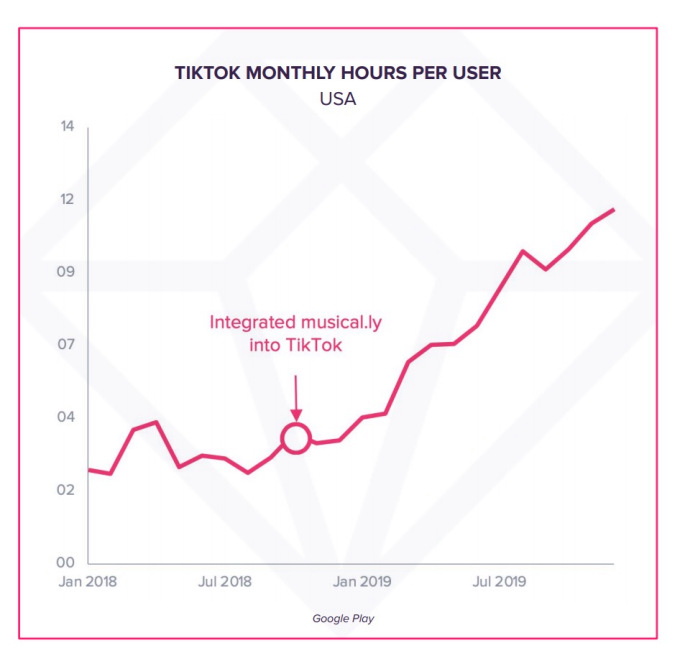 Fuera de los juegos, TikTok ha aumentado combinando elementos de las principales categorías como redes sociales, video y entretenimiento. Después de fusionarse con Musical.ly, ha implementado rápidamente más funciones de edición de video y ha aumentado la inversión publicitaria de forma agresiva para aumentar su base de usuarios e impulsar el compromiso. Para diciembre de 2019, los usuarios de EE. UU. Pasaban 16 horas y 20 minutos en la aplicación por mes, en promedio, en comparación con 5 horas y 4 minutos en agosto de 2018.