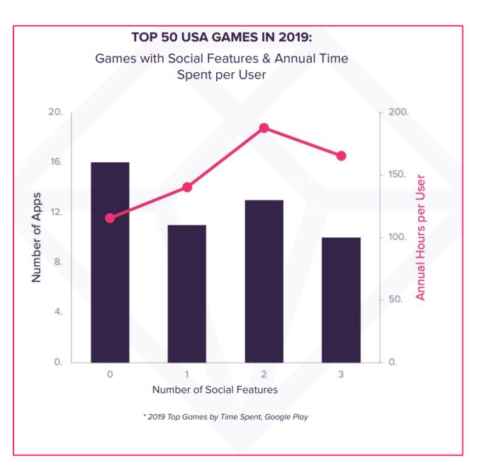 Más de dos tercios de los 50 juegos principales han agregado al menos una función social, ya sea invitar a un amigo a jugar, asistencia social para progresar, gremios o clanes o chat en la aplicación. Esto, a su vez, ha llevado a los jugadores a pasar más tiempo en los juegos, ya que pueden conectarse con amigos allí.