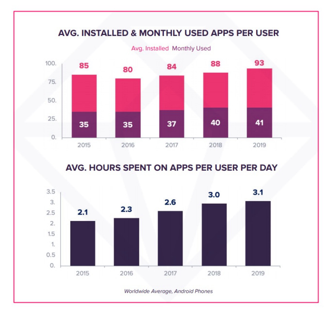 Los consumidores móviles están descargando y utilizando más aplicaciones que nunca. Según datos recientes de App Annie, los usuarios de dispositivos móviles ahora tienen 93 aplicaciones en su teléfono a fines de 2019, en comparación con 85 aplicaciones a fines de 2015. Ahora también usan alrededor de 41 aplicaciones por mes, en comparación con 35 en 2015. En relación con este aumento, los usuarios ahora también pasan más horas al día usando aplicaciones. En todo el mundo, el tiempo diario dedicado a las aplicaciones ha aumentado a 3,1 horas por día en 2019, en comparación con 2,1 horas por día en 2015, por ejemplo.