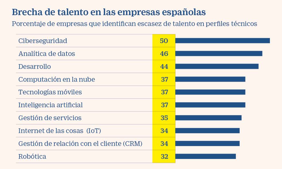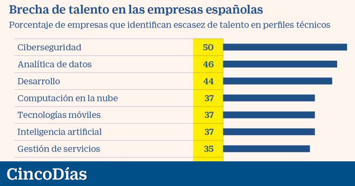 Según LinkedIn, en los próximos cinco años se crearán más de dos millones de nuevos empleos relacionados con la tecnología en España. Crecerá especialmente el ámbito del desarrollo de software, donde se estima que haya una oferta de 1.302.000 empleos; seguido de los perfiles cloud, que contarán con 315.000 puestos. Completará el podio el campo del análisis de datos, la inteligencia artificial y el machine learning, que ocupará a unas 265.000 personas. El 46% de las compañías, sin embargo, asegura que tienen dificultades para encontrar los perfiles digitales que necesitan. Un problema al que se añade que el 49% de las empresas españolas no capacita a sus empleados en estas competencias. La ciberseguridad y la analítica de datos son las dos áreas en las que existe una mayor preocupación, pues prácticamente la mitad de los encuestados identifica escasez de talento.