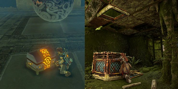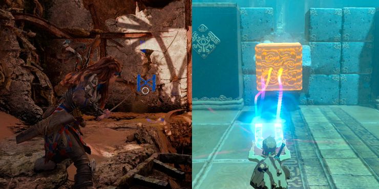 Con el éxito de Zelda: Aliento de lo salvaje y los diferentes Santuarios en los que inspirarse, no sorprende que Horizonte Prohibido Oeste incluiría desafíos similares. Muchos de los Santuarios de Zelda: Aliento de lo salvaje implica mover objetos con Magnesis o Stasis para permitir que Link progrese. Horizonte Prohibido Oeste simplifica esta idea con cajas ocultas que Aloy debe encontrar y arrastrar para llegar a nuevas áreas de las Ruinas. De alguna manera, las Ruinas en Horizonte Prohibido Oeste son más agradables, porque solo hay unos pocos en comparación con la gran cantidad de Santuarios en Zelda: Aliento de lo salvaje, por lo que se sienten mucho menos repetitivos. Sin embargo, los rompecabezas para muchos de los Santuarios en Zelda: Aliento de lo salvaje y las nueve ruinas en Horizonte Prohibido Oeste siguen la misma estructura básica.