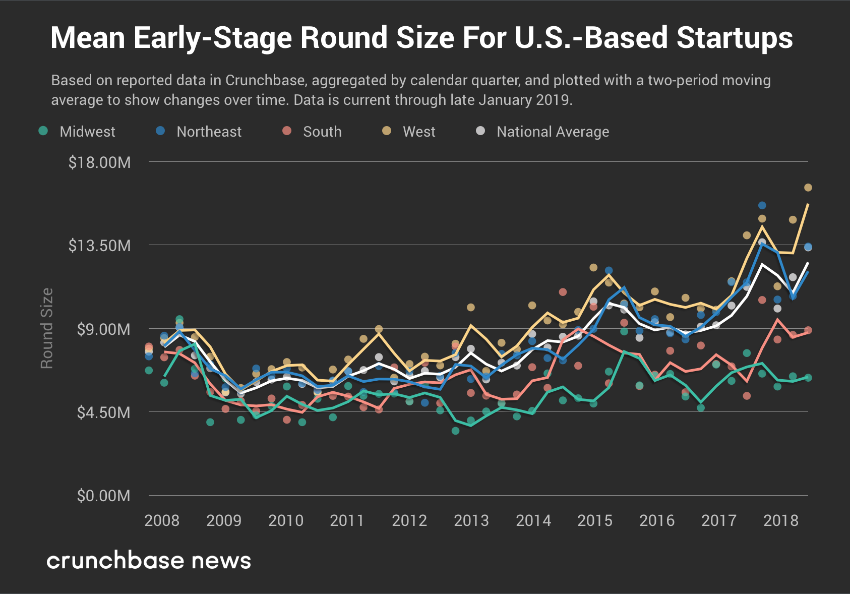 En un análisis publicado a principios de esta semana, encontramos que el acuerdo promedio en la etapa inicial a nivel nacional creció más del 20 por ciento entre 2017 y 2018. Cuantificamos que las compañías en las costas aumentan más que sus contrapartes en el interior y encontramos algunas indicaciones de que el Medio Oeste se queda atrás. de la NACION.