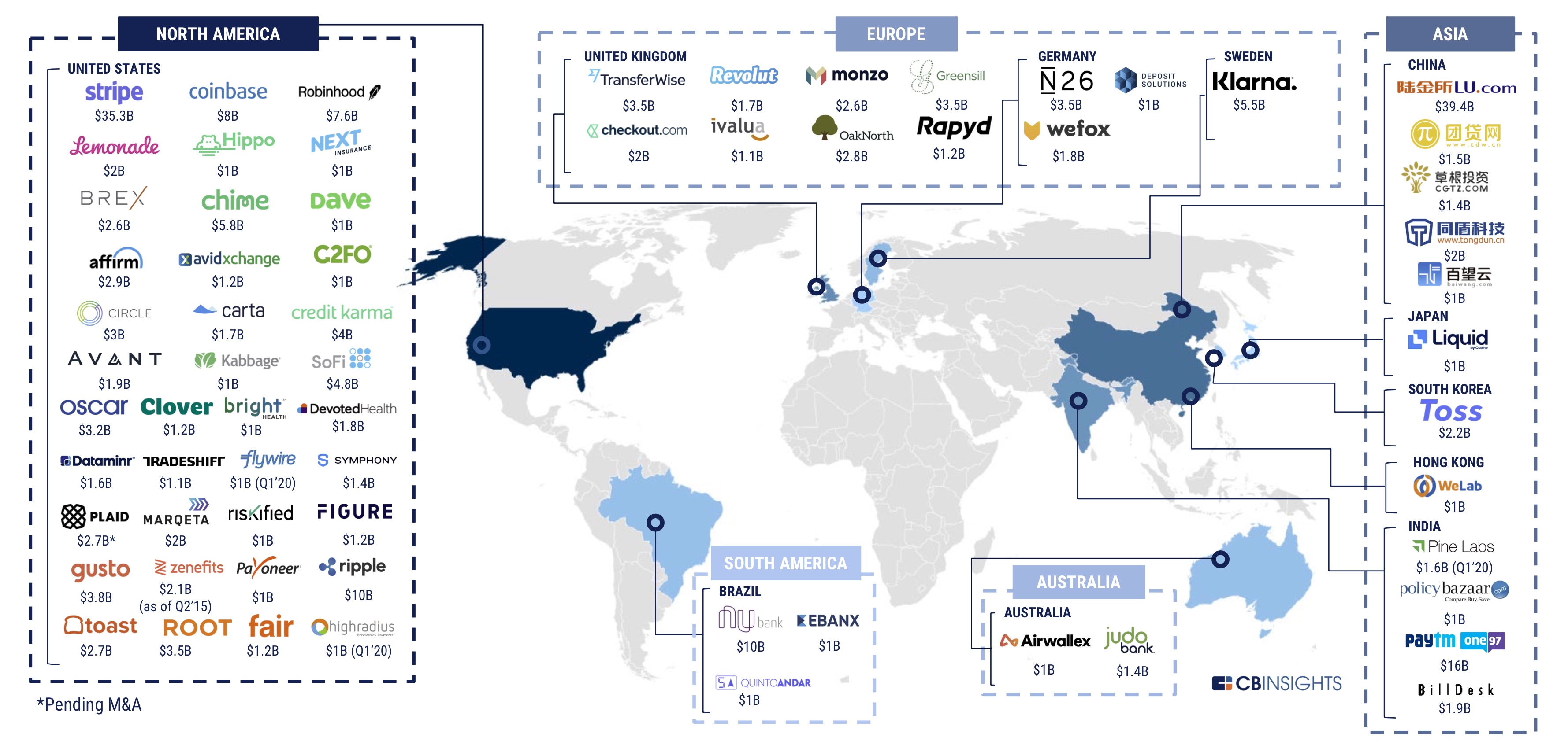 El mercado mundial de tecnología financiera hoy tiene 67 unicornios a principios de este mes (CB Insights)
