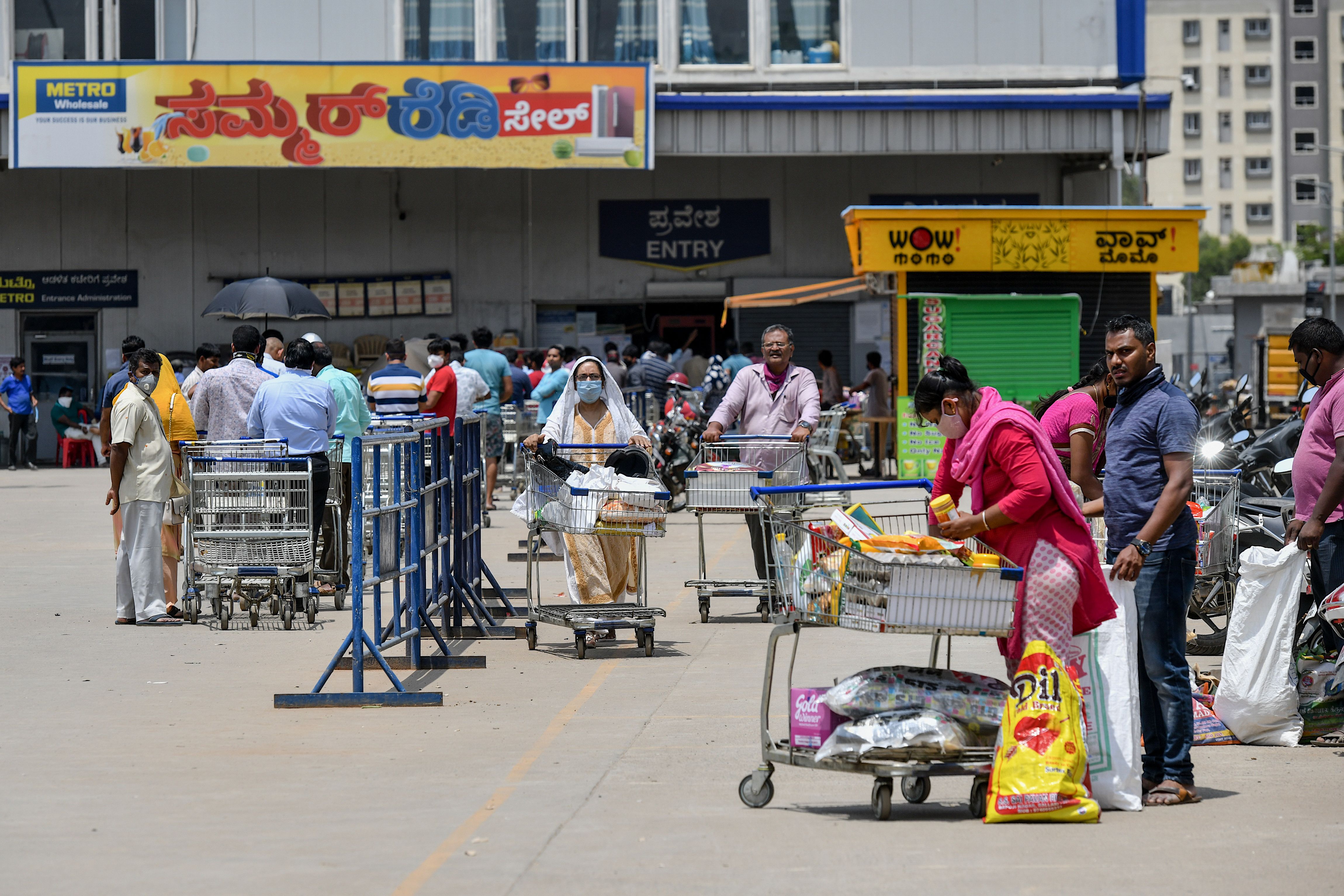 La gente compra comestibles en un supermercado durante el primer día del bloqueo nacional de 21 días impuesto por el gobierno como medida preventiva contra la propagación del coronavirus COVID-19, en Bangalore, el 25 de marzo de 2020. (Foto de MANJUNATH KIRAN / AFP vía Imágenes falsas)