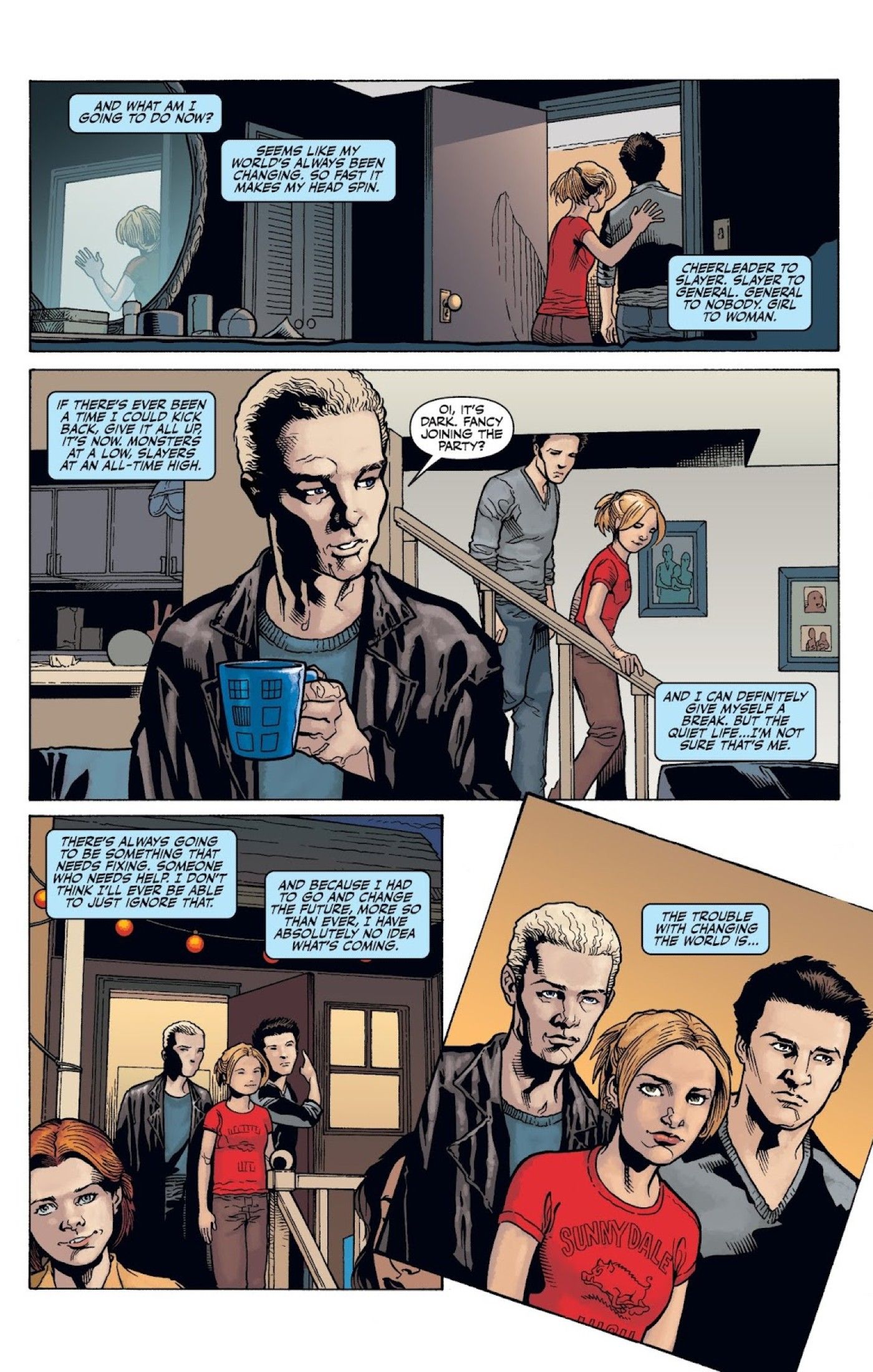 Durante todo esto, Buffy monologa sobre la totalidad de su viaje, que se remonta al primer episodio de Buffy la caza vampiros. ella se fue de “de animadora a Slayer. De Slayer a General. De General a nadie. De niña a mujer”. Con la cantidad de cazadoras en su punto más alto y la cantidad de monstruos en su punto más bajo, Buffy se da cuenta de que ahora es el momento de descansar finalmente. El número termina con las últimas palabras de Buffy de toda la continuidad: “El problema de cambiar el mundo… vale la pena”.