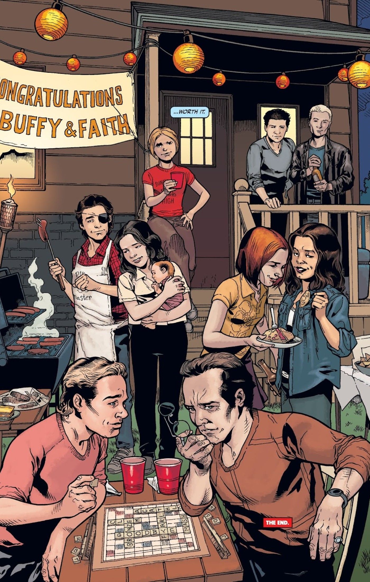 “/> Avance rápido hasta un par de semanas después. En ese tiempo, Buffy y Faith se convierten en agentes de policía y ambas obtienen el final feliz que siempre quisieron, haciendo la transición para finalmente vivir una vida normal. Después de consolar a Angel mientras llora la vida de Illyria que se perdió durante la batalla, los dos se unen a Spike en la cocina. Sus dos antiguos amantes, ahora amigos aún más cercanos, se unen al resto de sus aliados afuera para una fiesta que celebra el logro de Faith y Buffy.