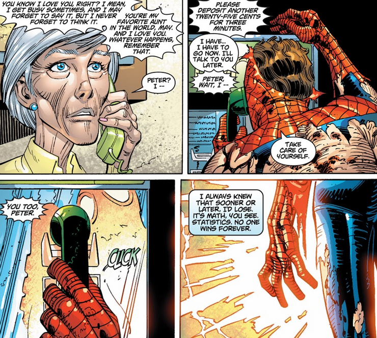 en 2001 El asombroso Hombre Araña #34 por J. Michael Straczynski, John Romita Jr. y Scott Hanna, Spider-Man está involucrado en una batalla de doce horas con Morlun, un vampiro psíquico de una realidad diferente. Peter está maltratado y magullado, hambriento y cansado, pero Morlun permanece imperturbable e imperturbable, demostrando un nivel de fuerza que Peter compara con Hulk. Después de poner distancia entre los dos y resignarse a la idea de que esta es su última pelea, Peter llama a la tía May y le dice que la ama, que es su tía favorita en el mundo y que se cuide antes de ahorcarse. arriba. Es una escena conmovedora que deja en claro que Peter realmente cree que se le acabó el tiempo, y esto es todo lo que quiere que May sepa.