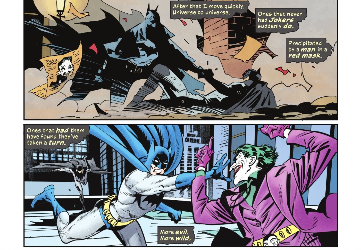 En ordenanza #135 por Chip Zdarsky, Mikel Janín, Mike Hawthorne y Jorge Jiménez, Bruce está decidido a detener a Red Mask, también conocido como Darwin Halliday, una variante del Joker. Halliday intenta fracturar su mente para poder convertirse en el Guasón de su mundo, pero descubre que solo puede crear Bromistas, no convertirse en uno mismo. Halliday se aventura en el multiverso y comienza a viajar a otros mundos, creando nuevos comodines o resucitando a los muertos.