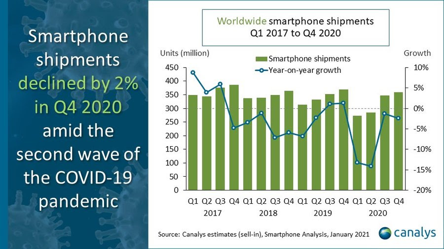 Las cifras siguen siendo bajas para el cuarto trimestre de 2020, pero solo han bajado un 2% por empresa. Eso se debe en gran parte a lo que representó el mejor trimestre del iPhone, ya que la compañía presentó cuatro teléfonos deportivos 5G. Canalys muestra un aumento del 4% para Apple, ya que el dispositivo llegó a un lanzamiento más amplio de 5G justo a tiempo para la temporada navideña.