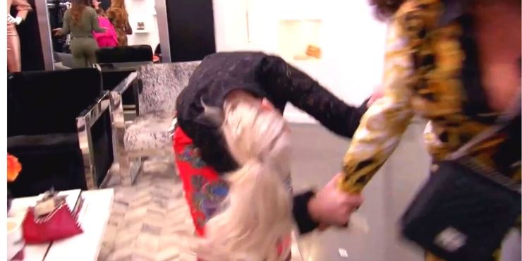 Porsha tuvo suficiente, agarró el cabello de Kenya y la arrastró al suelo. Kenia apareció y salió del escenario, pero los productores y compañeros de reparto sostuvieron a Porsha en el suelo mientras ella comenzaba a sollozar de vergüenza.