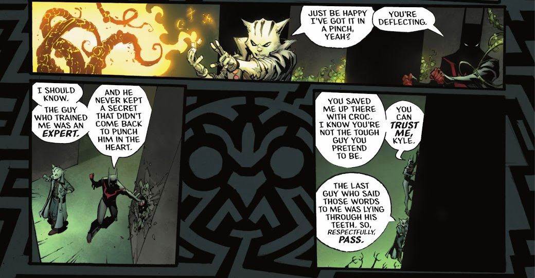 En Batman del futuro: neogótico #3 Por Jackson Lanzing, Collin Kelly, Max Dunbar, Sebastian Cheng y Hassan Otsmane-Elhaou, Batman y su compañero Kyle the Catboi continúan su búsqueda de la Corte de los Búhos, algunos niños desaparecidos y cualquier secreto que guarde la infinita oscuridad. Batman comienza a interrogar a su compañero sobre su pasado, pero Kyle desvía o evita repetidamente sus preguntas, dejando que Terry le recuerde que fue entrenado por el maestro de esa táctica evasiva.