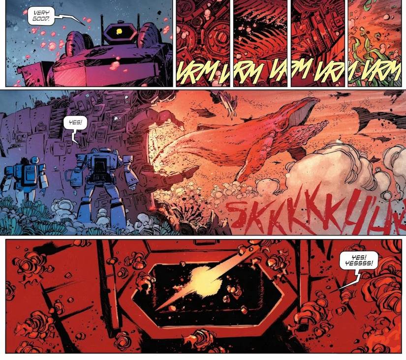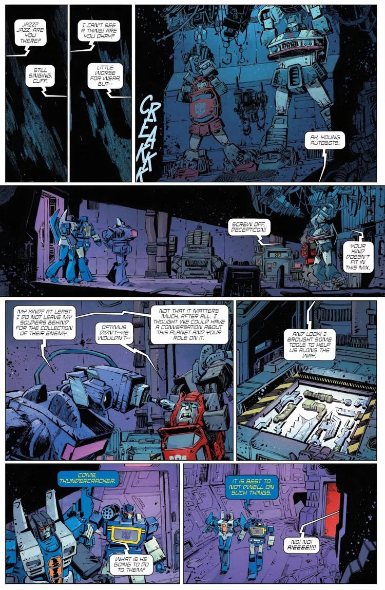 Shockwave parece continuar su sombrío trabajo con sus nuevos prisioneros Cliffjumper y Jazz, a quienes los Autobots se vieron obligados a dejar atrás en el campo de batalla después de su derrota.Pensé que podríamos tener una conversación sobre este planeta y tu papel en él.”, explica Shockwave a los dos Autobots capturados. “¡Y mira!” continúa, revelando una espantosa colección de instrumentos de tortura, “Traje algunas herramientas para ayudarnos en el camino.“ Los lectores no ven lo que Shockwave les hace a Cliff y Jazz, pero los globos de diálogo de ellos gritando fuera del panel son lo suficientemente horrorosos.