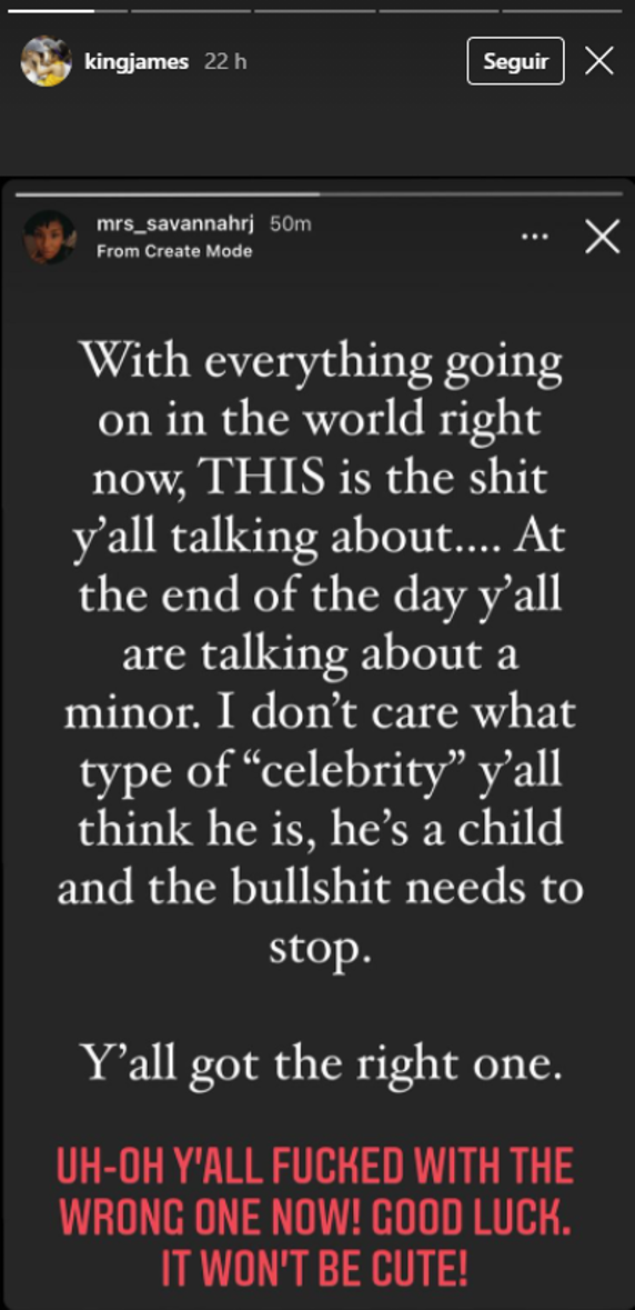 “Con todo lo que está pasando en el mundo y esta es la mierda de la que están hablando todo el día. Al final estáis hablando de un menor. Me da igual el tipo de ‘celebrity’ que se creen que es. Es un niño y toda esta mierda tiene que terminar”, escribió LeBron en su Instagram.