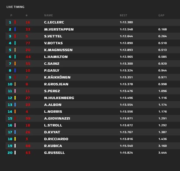 El monegasco superó en 0”168 a Max Verstappen, que al volante de su Red Bull dio con la tecla en los ajustes de su monoplaza para mostrarse entre los grandes candidatos al triunfo este fin de semana, superando en la tercera sesión a un Vettel que sigue sin mostrarse tan cómodo como Charles con su Ferrari, sin poder hacer nada ante el empuje, hambre y talento de su joven compañero. Por detrás, Valtteri Bottas fue el mejor Mercedes, con un tiempo solo 72 milésimas mejor que un sorprendente Magnussen, el único de los Haas que presenta un nuevo paquete aerodinámico que parece haber funcionado muy bien entregándole la quinta posición por delante de un Hamilton perdido.
