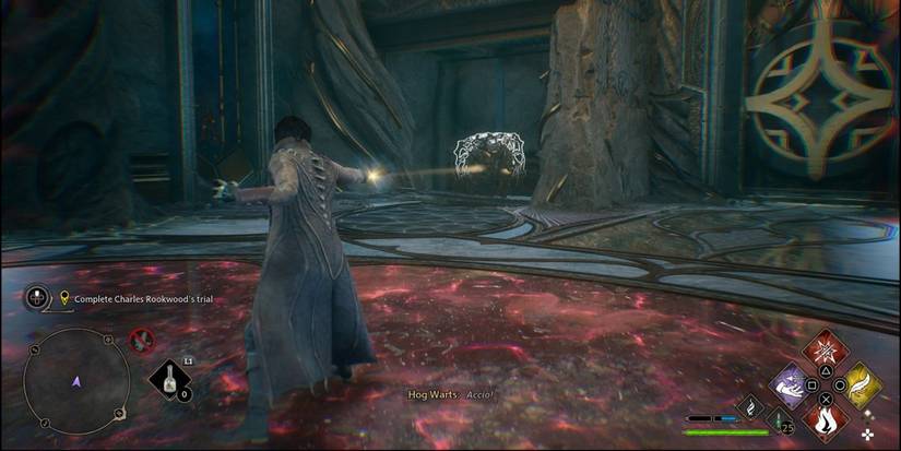Debes resolver cinco partes importantes para completar la prueba de Charles Rookwood, siendo el primer paso el más fácil. Sube las escaleras a tu derecha e interactúa con el punto de Magia Antigua para activar un portal y generar un cubo. Vuelve a bajar las escaleras, ignorando el pilar alto, y Usa Accio para extraer una caja debajo de la salida a la que apuntas.ubicado en la esquina izquierda de la habitación.