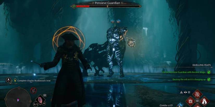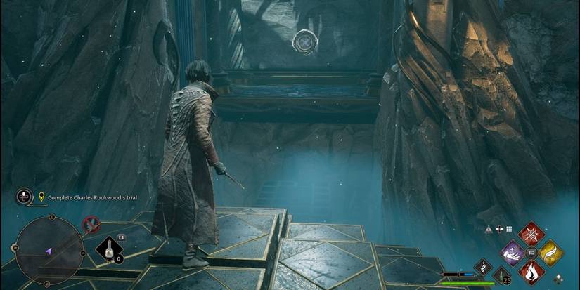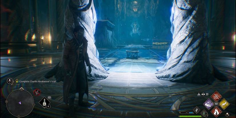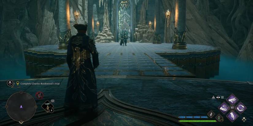 En el final de prueba de Charles Rookwood, los jugadores enfrentan los desafíos más abrumadores hasta el momento. Baja las escaleras y gira a la izquierda hacia una habitación donde un par de Pensieve Sentries cobrarán vida. Enfréntate a estos enemigos, luego avanza a la siguiente habitación, sube las escaleras y atraviesa la puerta hacia otra arena circular.