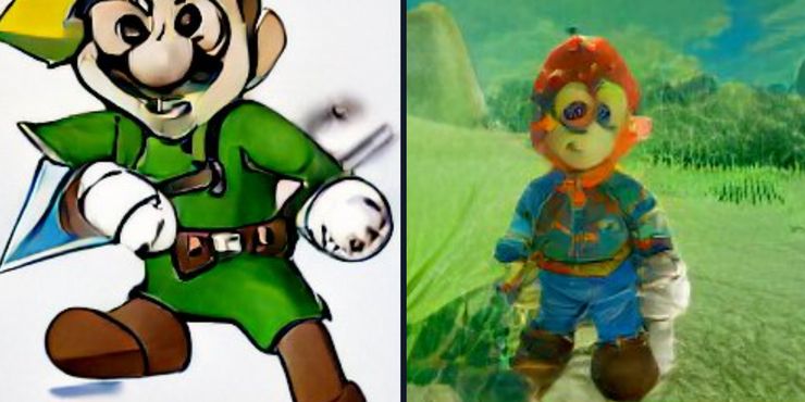 Para profundizar en las creaciones de Dall-E, la IA se acercó a la fusión tomando ejemplos de Link y Mario a lo largo de sus respectivas series. En la imagen de la izquierda, la icónica ropa verde y las extremidades rechonchas del Héroe del Tiempo sugieren que Dall-E prefería al Link de Ocarina del tiempo y MajoraMáscara de. Sin embargo, la imagen de la izquierda pinta una imagen diferente, ya que el fondo está claramente inspirado en los paisajes de Hyrulian de Aliento de lo salvaje. Además, la forma del cuerpo es claramente la de Mario, pero el torso parece ser un intento de capturar la túnica azul de Link. Pero la cara es quizás la parte más notable. Los ojos y la boca no parecen provenir del pasado de Mario o Link. El misterio detrás de ellos y la suave sonrisa de su boca son tan seductores como la sonrisa de Mona Lisa. Y al igual que esa sonrisa, tal vez sea mejor dejarlos en el misterio. para reunir La leyenda de Zelda‘s Link, que ha derrotado la manifestación del mal y el poder de su universo en múltiples ocasiones, con Mario, el plomero que inmediatamente comienza a bailar breakdance después de salvar a su esposa, sería demasiado para intentar comprenderlo.